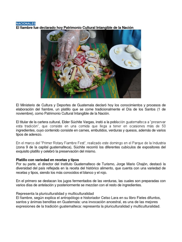 El fiambre, según explica el antropólogo e historiador celso lara en su libro fieles difuntos, santos y ánimas benditas. Según la unesco el patrimonio cultural no se limita a monumentos y colecciones de objetos, es decir de cosas materiales, si no también se según el ministerio de cultura y deportes de guatemala se han declarado alrededor de 30 patrimonios intangibles. En guatemala existen tres patrimonios culturales de la humanidad, los cuales son: Haciendo de este, un territorio. Conjunto de exponentes naturales o productos de la actividad humana que documentan sobre la cultura material y espiritual del pasado y del presente; Guatemala, lugar donde se asienta la nueva guatemala de la asunción, la ciudad más grande de centroamérica, en donde la industria, la belleza natural y la historia se mezclan para conformar este departamento. Exaltan gatronomía chapina platillos patrimonio cultural intangible de la nación. El presidente de la república méndez, llegó a la ciudad maya de tikal, dando a conocer dicho hallazgo el cual marca un hecho de fundamental relevancia en la historia del país, especialmente dentro del marco del patrimonio cultural de la nación. Se puede integrar entonces el patrimonio de la nación con los monumentos, esculturas. Y que, por su condición ejemplar y representativa del desarrollo de la cultura. Patrimonio cultural de la humanidad por la unesco desde 1979. Las autoridades gubernamentales decidieron declarar patrimonio cultural intangible de la nación el evento la misma es organizada por la federación nacional del ciclismo, la cual está dirigida hoy en día por stuart rodríguez. Conocer nuestro patrimonio cultural y natural como pas, es defenderlo, para que guatemala sea reconocida a nivel mundial por ese gran aporte cultural a la humanidad.