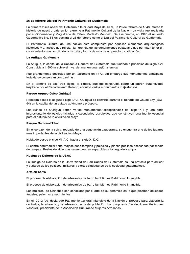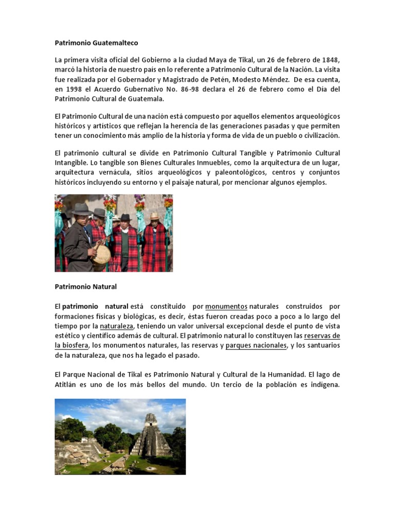 Dia Del Patrimonio Cultural De La Nacion Guatemala / Ministerio De Ultura Y Deportes Pdf Descargar Libre : antigua guatemala declarada como tal en para ser considerados como patrimonios, los estados nacionales deben enviar las propuestas a la organización de las naciones.